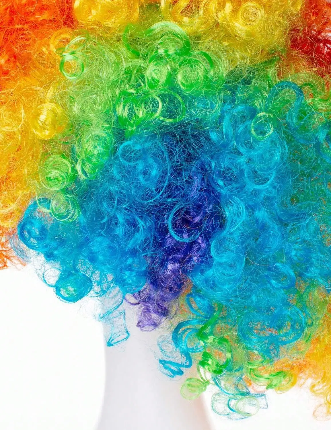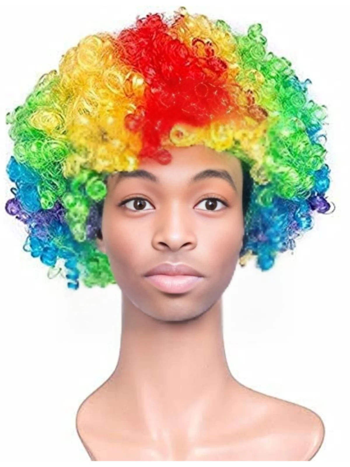 Bring joy, color, and character to any celebration with the Unisex Rainbow Afro Clown Wig!
